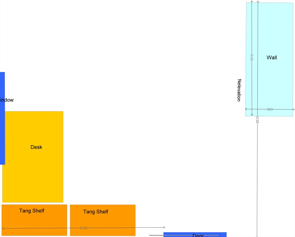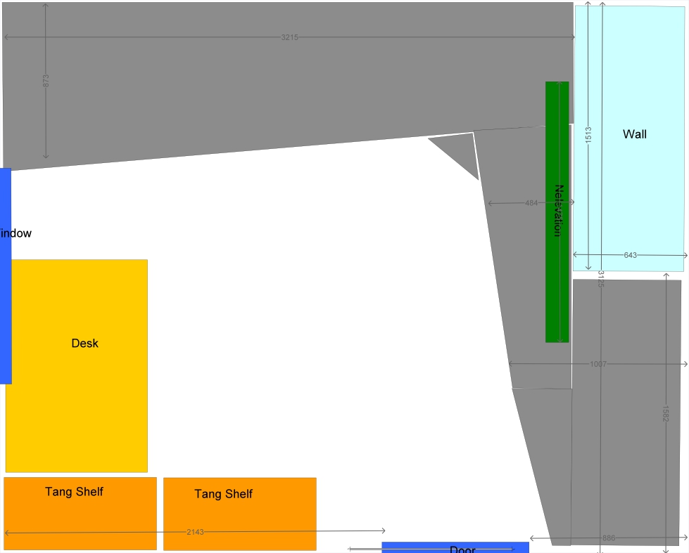 Room Outline showing extrusion (Blue box) and location of door, window and desk. Drawn from AnyRail which isn’t ideal for this.