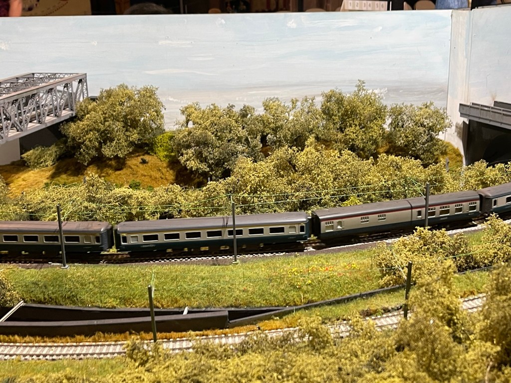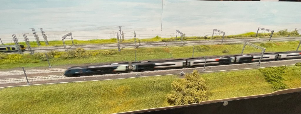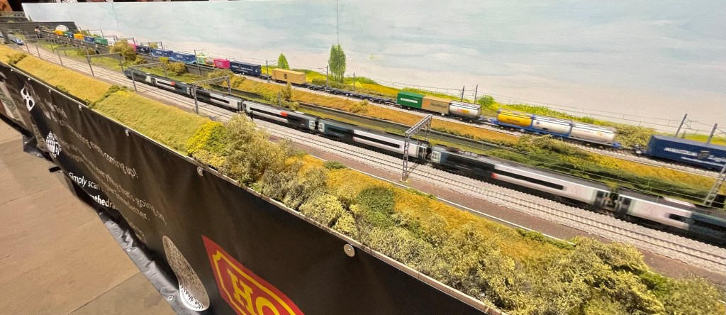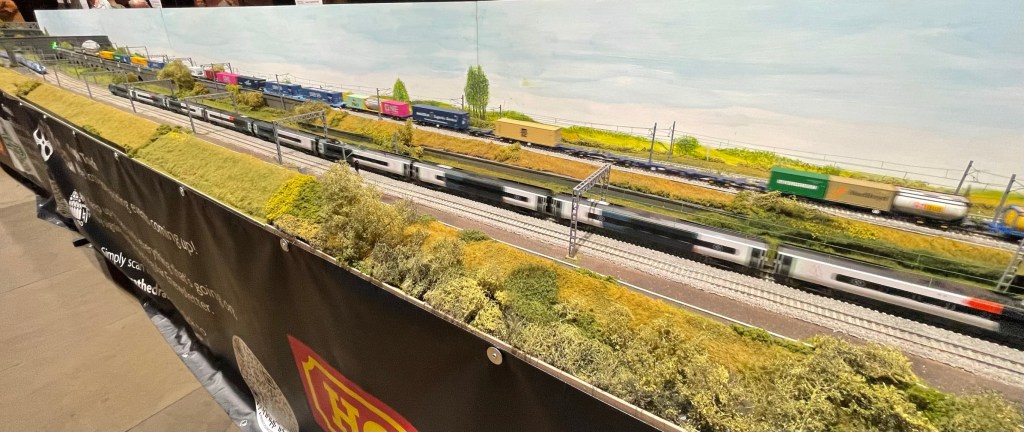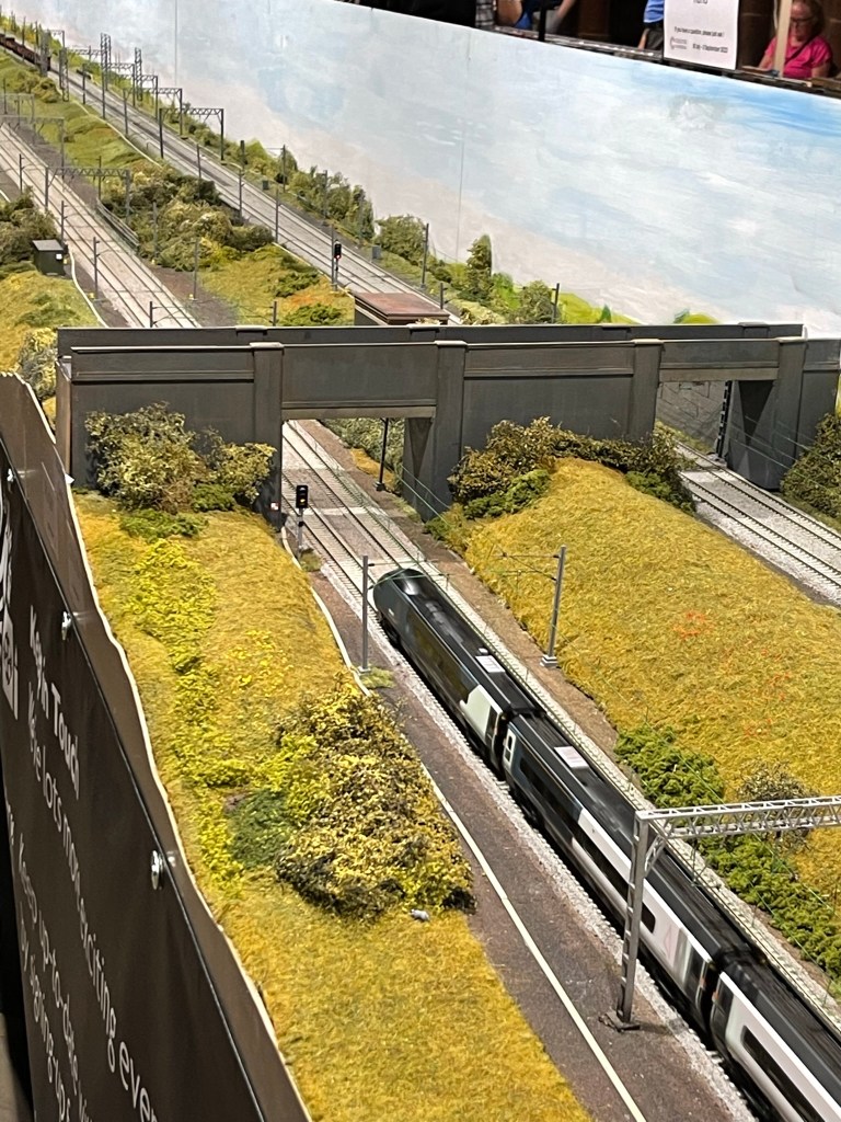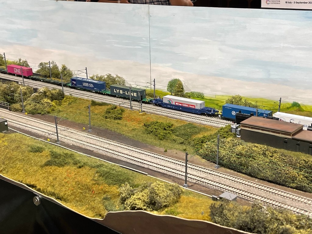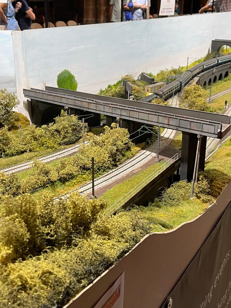 I’ve taken the opportunity this year to visit the Railnuts WCML layout in Chester Cathedral. This 68 Feet long model is a great model and features a number of the elements that I wanted to include on Kilsby Drift. As well as seeing lots of different trains running up and down I wanted to get a sense of how the longer layout looked and the length of trains in use. I didn’t measure the longer ones but I think they would have been over 20 feet long with some very long container trains the day I was there. As well as Thomas for younger visitors there were also a couple of steam driven goods trains and some BR Blue on display along with the modern units including the Avanti branded pendolinos. The northern end of the layout with 3 bridges, cuttings and the overpass was particularly impressive.
