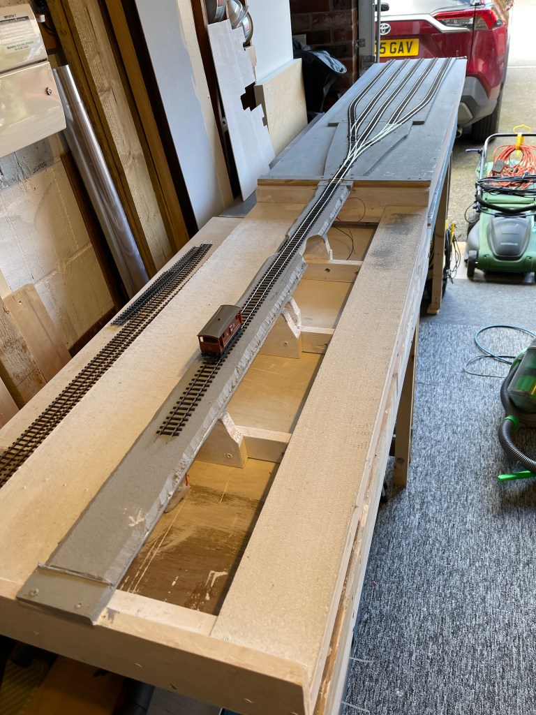 Progress on the boards has moved on a couple of stages, The bridge frameworks are now all in place, for the first outing I will use Scalescenes brickpapers for the bridges and abutments and potentially later on replace with Plasticard if I don’t like the look. The track has been ballasted with Gaugemaster brown ballast using a PVA mix and a dropper and the embankments were covered with a layer of PVA and then wood chippings/dust to provide some relief to the paper mache smooth finish. I have put some ruts in for the track underneath Raglans drove (shown below) and the other two bridges at Cattle creep and Hackers. The hole in the foreground is for the distant signal and the holes are in place ready for 4 signals to be added on the other boards