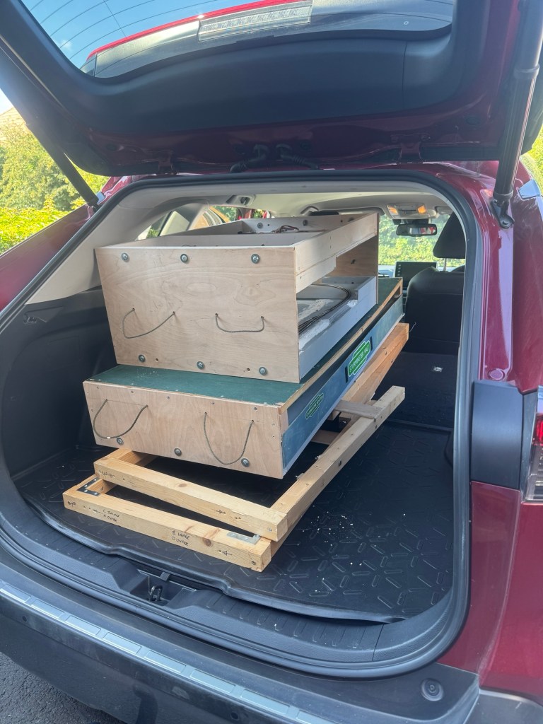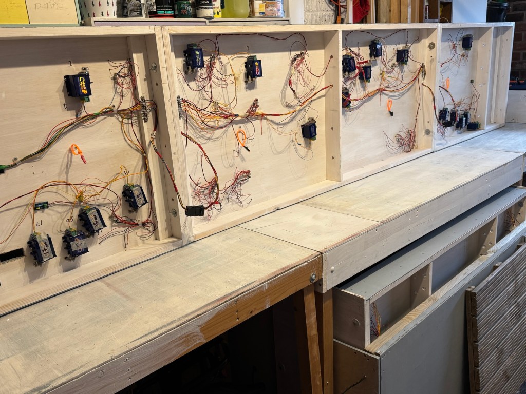 The new baseboards have been built with exhibiting in mind and will sit on top of the existing trestles. The two smaller boards have an operating area at each end and will have a display board for information and for transport will be stored face to face as a box. The existing cover for the large board has been recovered and reused.