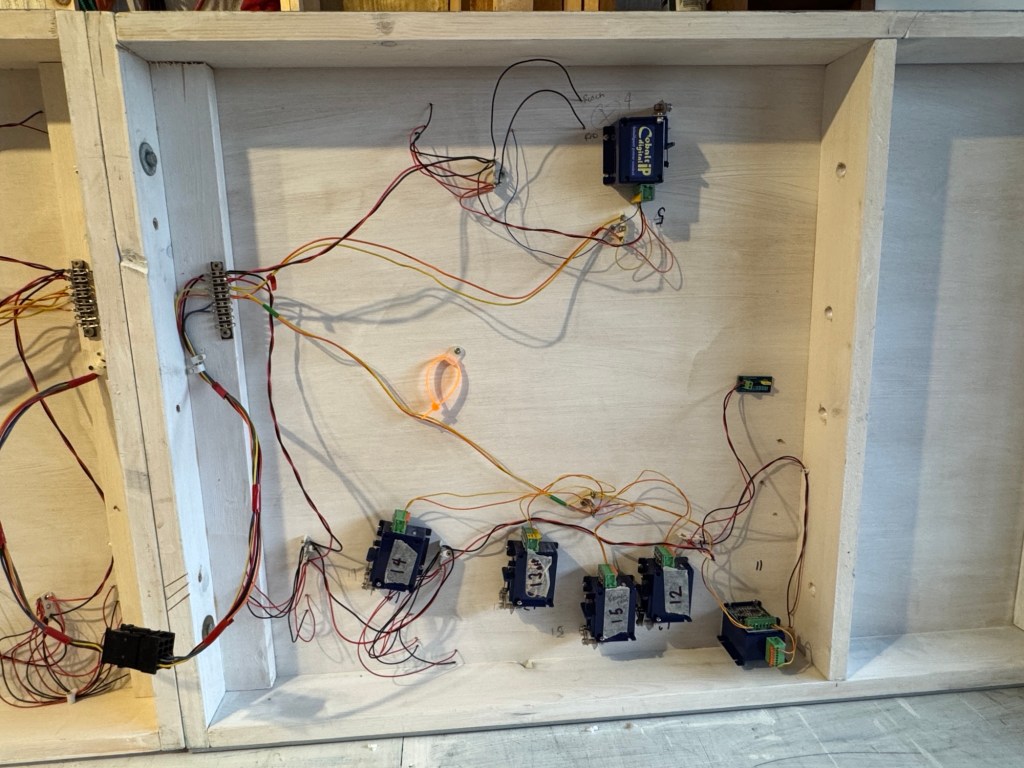The layout is DCC-operated and currently operated using a Gaugemaster Prodigy controller and JMRI software. The laptop has a full mimic panel that controls routes for each Fiddleyard road and the main routes through the station.